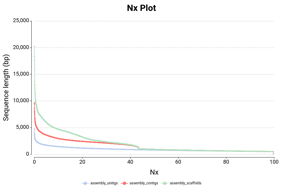 The Nx plot (Figure 5) shows Nx values as x varies from 0 to 100 %. The Nx values are displayed for unitigs, contigs and scaffolds.