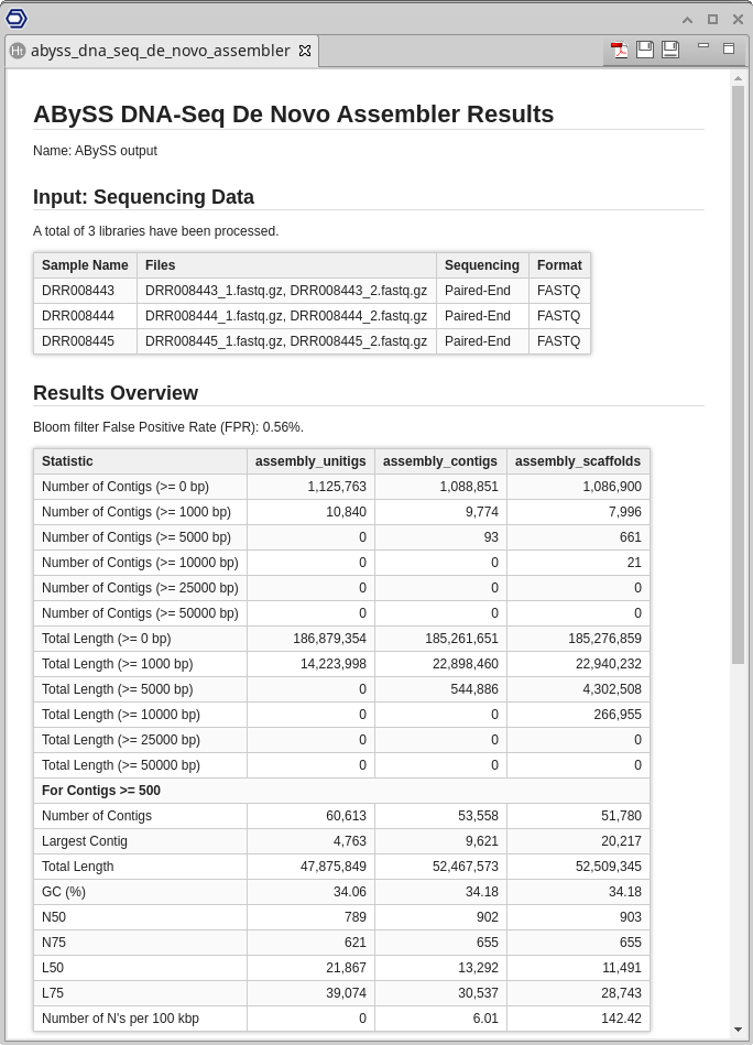 In addition to the resulting FASTA files, a report and a chart are generated. The report shows a summary of the DNA-Seq De Novo Assembly results (Figure 4). This page contains information about the input sequencing data and a results overview. The Results Overview table shows a number of common statistics used to describe the quality of a sequence assembly:
