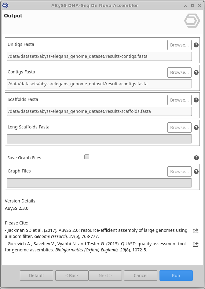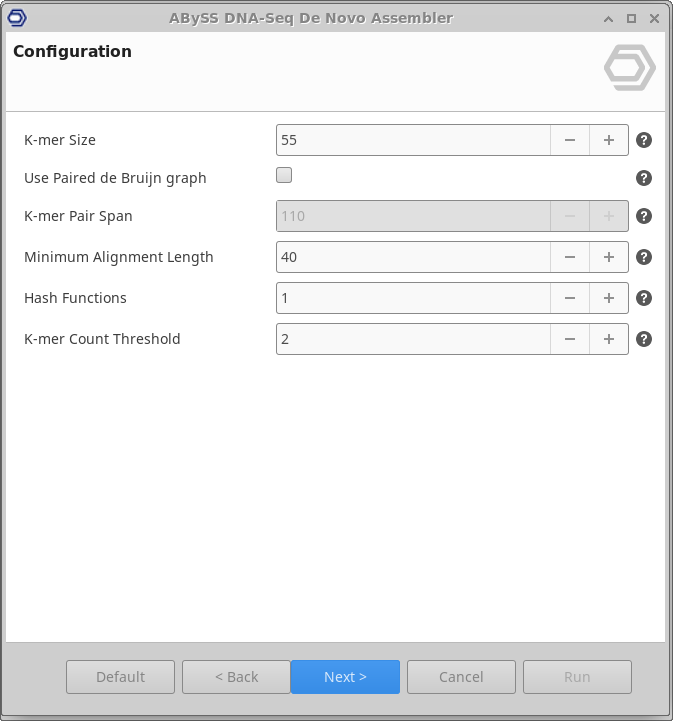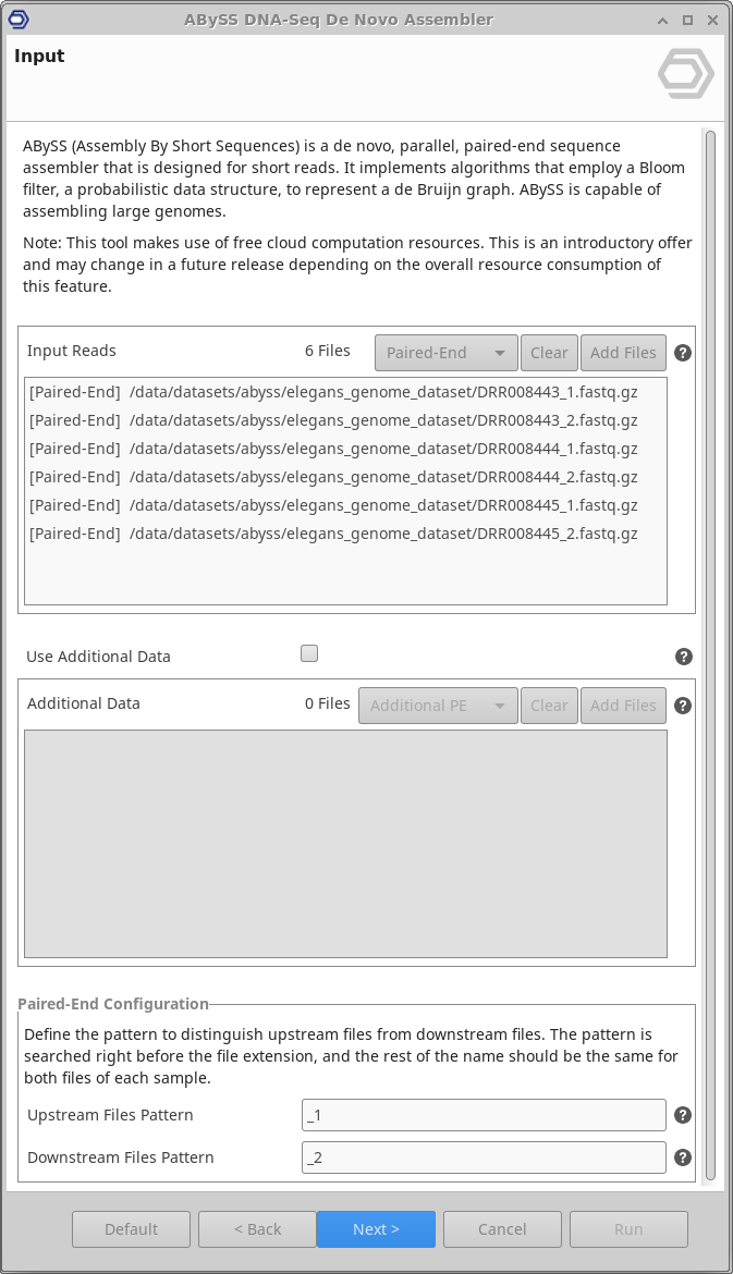 This functionality can be found under Genome Analysis → DNA-Seq de novo Assembly → ABySS. The wizard allows to select input files and adjust analysis parameters (Figure 1, Figure 2, and Figure 3).