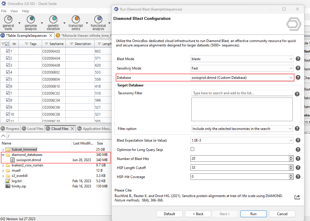 - Custom Database CloudBlast. It is possible to run BLAST against a database made of a custom protein fasta file using the OmicsBox Cloud resources.