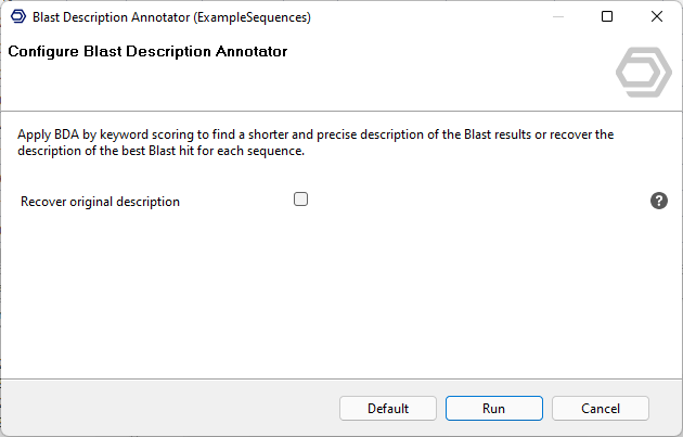 This will run the BDA algorithm. It also allows recovering the original description: When this option is marked the sequence description column on the Main Sequence Table will contain the top blast hit description and not the one from the BDA. For further details, please see the Blast Configuration Page section.