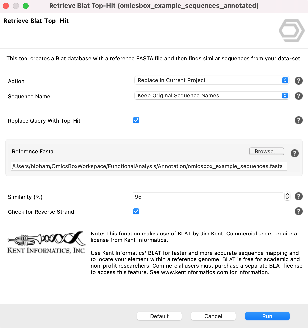 In OmicsBox BLAT is used to replace query sequences of a dataset with the top-hit one found in a reference FASTA file. It can be found on the side panel Blast → Retrieve Blat Top-Hit.
