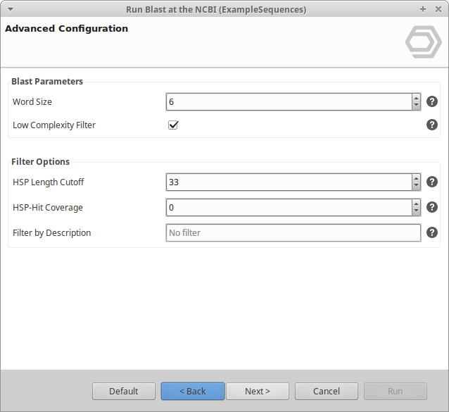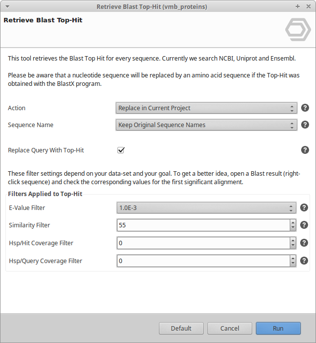 - Filters Applied to Top-Hit: For each Top-Hit (first significant alignment from an already performed BLAST), apply the filters (bottom part of the dialog) and search them in the corresponding database (online).