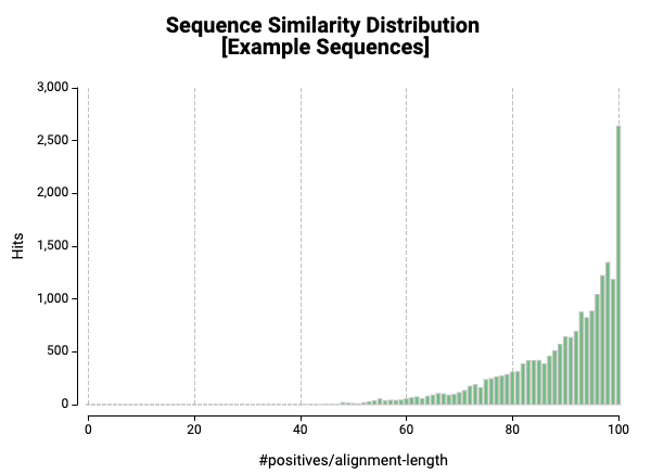 - Similarity Distribution: This chart displays the distribution of all calculated sequence similarities (percentages), shows the overall performance of the alignments and helps to adjust the annotation score in the annotation step. By looking at figure 15 it is possible to get an idea of how similar the query is to the hits. Knowing the overall similarity of the query sequences to the dataset can help decide whether to use a more or less restrictive Annotation CutOff. The smaller the similarity, the smaller the Annotation CutOff should be. This is not the only factor influencing the Annotation Score.