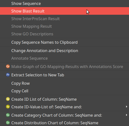 With a mouse the right click on a sequence, the Single Sequence Menu will be displayed and it is possible to see the BLAST results for each sequence individually. Show BLAST Results (figure 10) will generate a tab in the Results containing information on the results of the similarity search of the selected sequence. For each of the obtained hits, the following information is given: Hit id and definition Gene name assigned to the hit by its accession e-value of the alignment Alignment length of the longest hsp Positive matches of the longest hsp Hsp similarity of hit: Number of hsps mapped GO-Terms with its evidence code UniProt codes of the hit sequences.