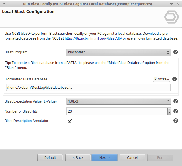 With Local BLAST you can blast the sequences against your own database. OmicsBox allows creating a Blast database from a FASTA file with the option "Make Blast Database'' (see Make Blast Database section). Download and format your database and choose the corresponding folder to see figure 9. Databases have to be formatted for NCBI Blast+.