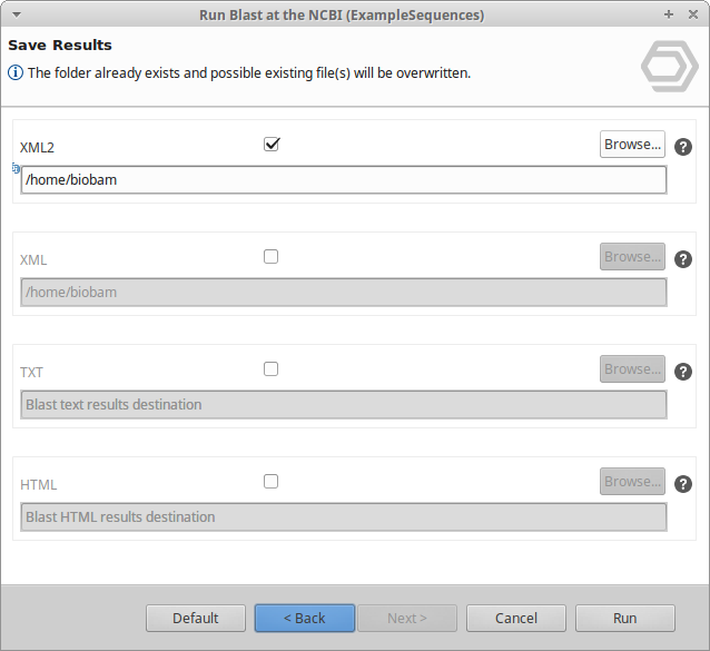 The results of the BLAST queries can also be directly saved to a file in different formats by selecting the corresponding checkboxes at the BLAST Save Results Page. If the chosen file already exists, upcoming results will be appended. Choose a format type to additionally save your BLAST results.