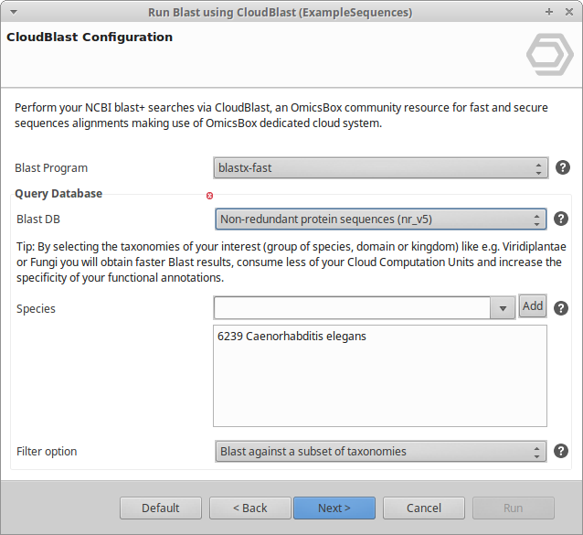 Each sequence alignment performed in the system consumes a certain amount of computation time depending on the sequence length and the blast algorithm (blastx, blastp) and the parameters used. The smaller the database you blast against the more sequences you can analyse with 6.000.000 Cloud Units (see Cloud Usage in the View Menu section to know how to monitor the Cloud Units). This means that e.g. if you blast against the vertebrate NR-subset you would be able to blast approx. one million (1.000.000) sequences. If you decide to blast against the NR database, the largest protein database available, it should allow you to blast approx. 80.000 sequences (with an average length of 800nt per sequence). One has to add the Species taxonomy id to blast against an NR-subset.