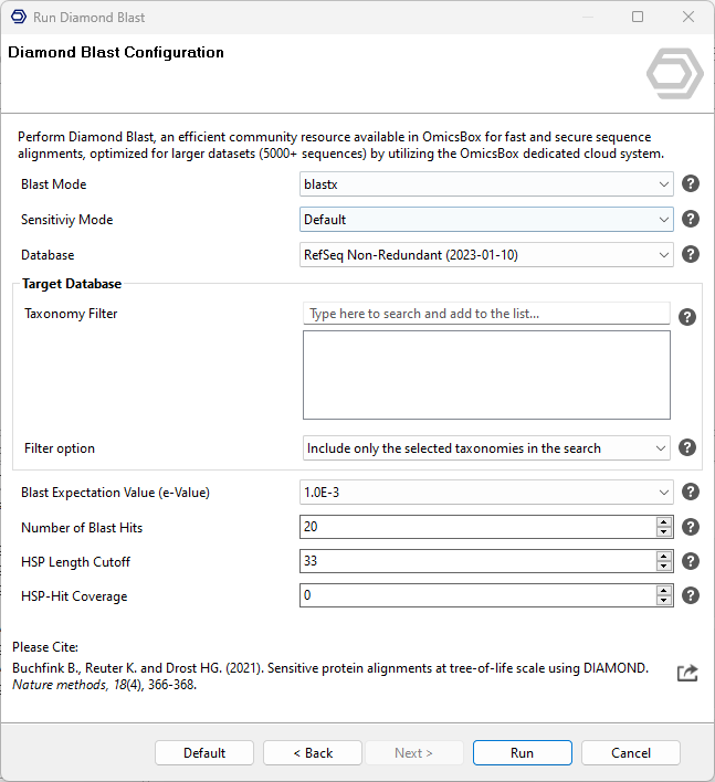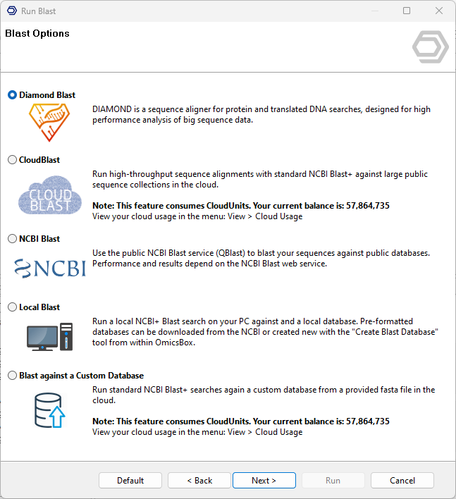 Figure 2: Choose between Diamond, CloudBlast, NCBI, Local, or Custom Database