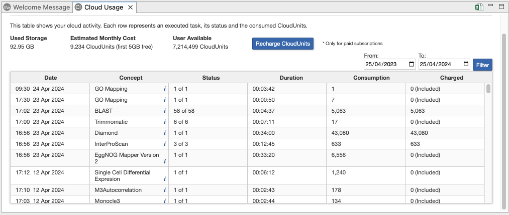 Currently, OmicsBox charges for cloud usage only for features related to sequence Alignments and Assembly (refer to the list below). The consumption of Cloud Units by these features is based on the duration (CPU seconds) required for their completion. All other functionalities within OmicsBox are available at no additional cost as part of your subscription.