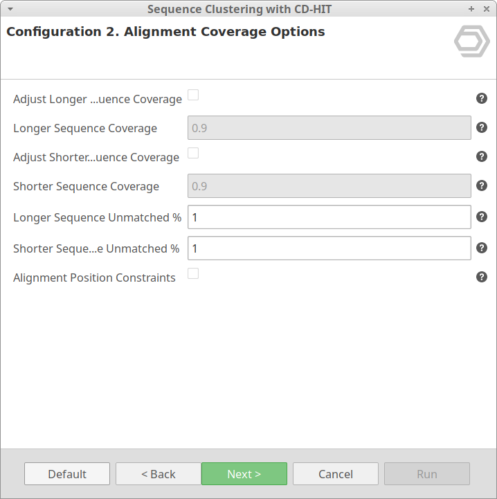 - Longer Sequence Coverage: Alignment coverage for the longer sequence. It is required as a proportion (0-1). If set to 0.9, the alignment must cover 90% of the longer sequence.