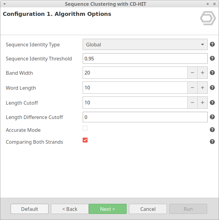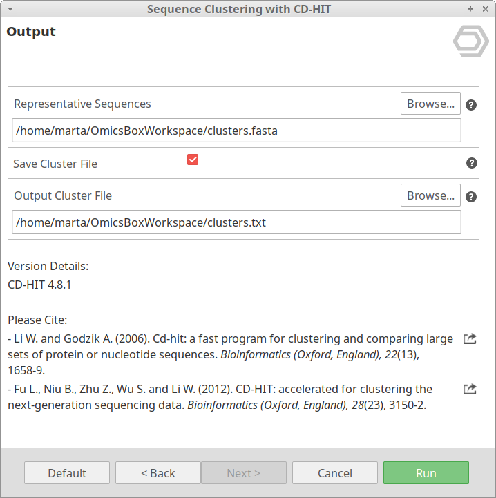 - Save Cluster File: CD-HIT produces a file containing information about each cluster. Set this option to obtain this file.
