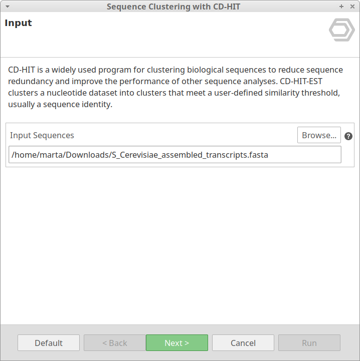 - Input Sequences: Select a FASTA file containing input nucleotide sequences to be clustered (e.g. assembled transcripts).