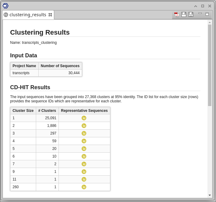 Finally, a report page (Figure 5) will show a summary of the Clustering results. In the "CD-HIT Results" table, the number of clusters of different sizes is shown. In addition, a list of the representative sequences of each type of cluster can be obtained by clicking on the "Id" buttons.