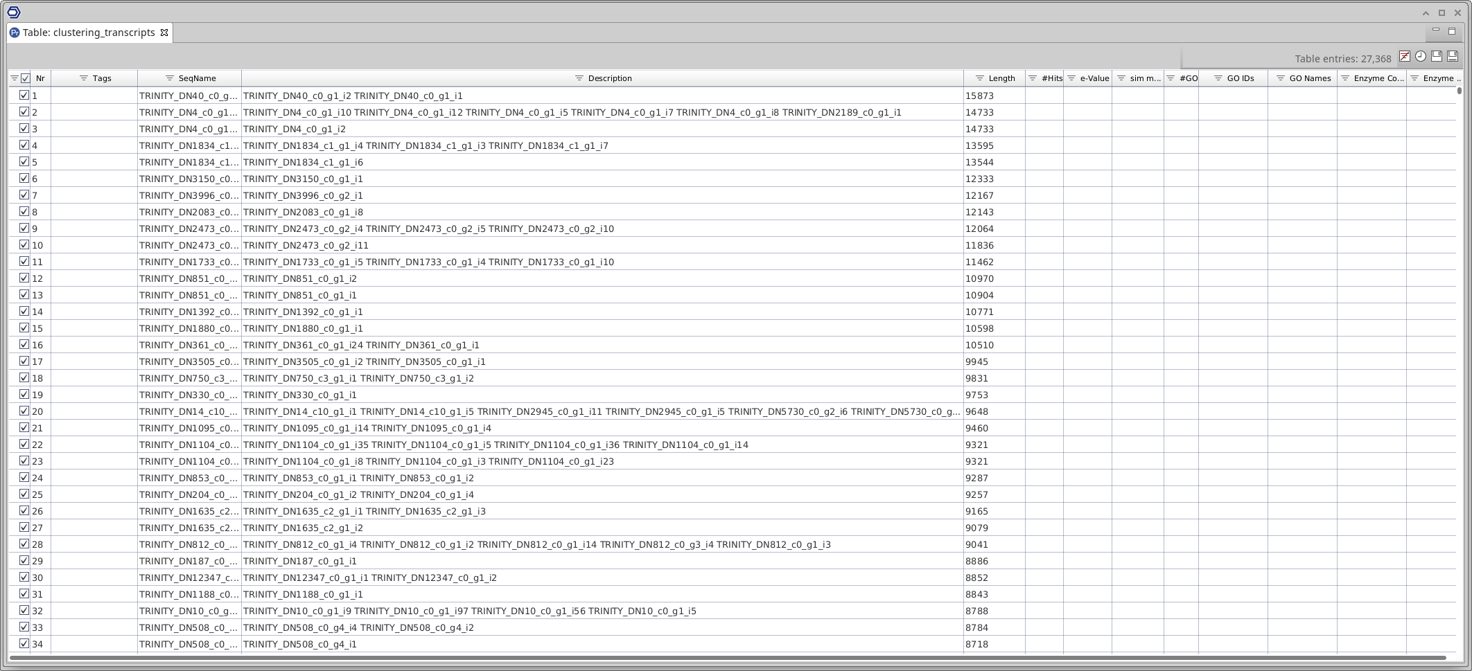 Once finished, results are returned in a project containing the representative sequence of each cluster. The SeqName field shows the identifier of the representative sequence. The Description field contains the sequence identifiers for the sequences that have been grouped into each cluster (Figure 4).