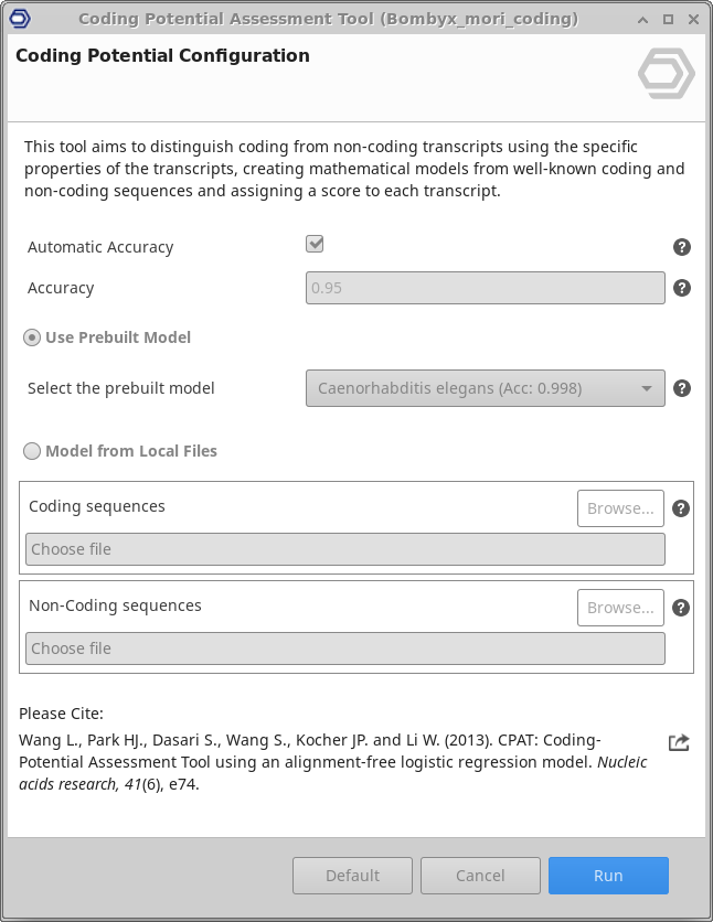 This tool can be found under Functional Analysis → Coding Potential Assessment (CPAT). The wizard allows adjusting analysis parameters (Figure 2).