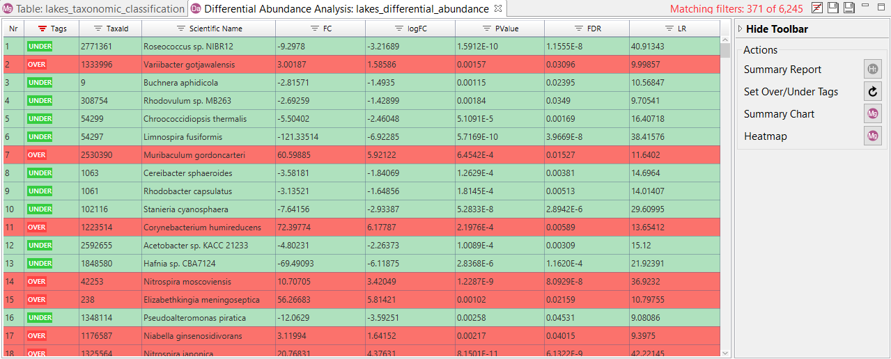Once the taxonomic abundance analysis has finished, a new table with the results will open (figure 10). Each row of this table corresponds to a different tested OTU. Each column contains: