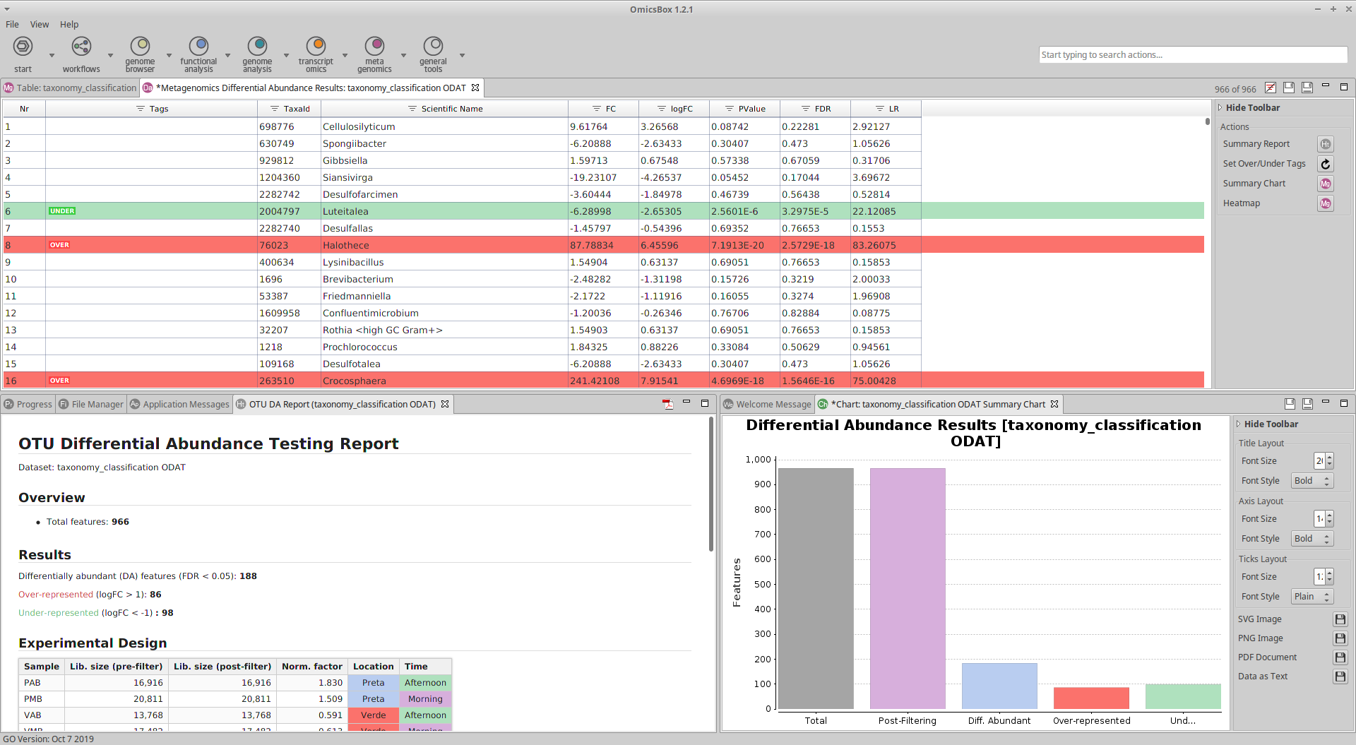 The Differential Abundance Analysis of Taxa is a tool to identify Operational Taxonomic Units (OTUs) that significantly differ between two microbial communities. This feature is based on edgeR, which belongs to the Bioconductor project, and implements statistical tests to evaluate the significance of OTU abundances between contrast and a reference group.