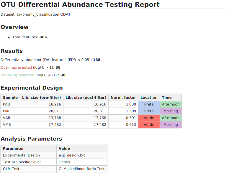 Creates an HTML report which can be saved in PDF with the main results of the Differential Abundance Testing: parameters used for the test, number of differentially abundant OTUs, experimental design, ... (figure 11).