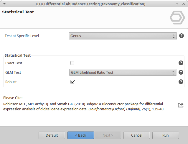 Here, you can select the statistical test to be used to detect the differentially abundant OTUs. The test will suppose that the OTU counts across groups are distributed as negative binomial random variables. Two different kinds of tests are available: