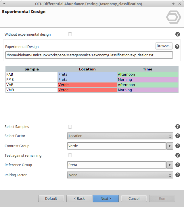 Here, the two groups for the test, reference, and contrast, have to be specified. You can select the groups by choosing which samples from the taxonomic classification project you want to include in each one, or by loading an experimental design file and selecting the conditions you want to test.