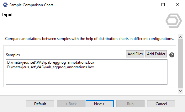 This feature helps to compare annotations between different samples with distribution charts. It also helps to compare GO annotations from EggNOG and PfamScan (or other tools) for the same sample. First, the different samples have to be selected. It is also possible to load external annotations through File > Load > Load Metagenomic GO Annotations and to load them here (figure 1).