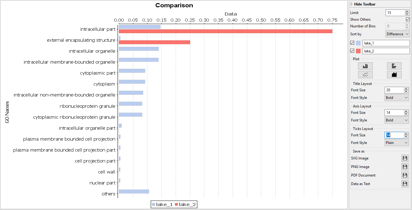 On the right we can see the comparison of two different samples, both annotated with EggNOG Mapper. Cellular Component GO levels from 5 and lower are shown, ordered by maximum difference. The graphic visualizes that the red sample has major activity in intracellular parts and external encapsulating structures, while the blue sample works in different parts of the cell.