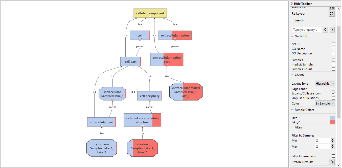 The colored GO graph on the right side visualizes the same data as above. Only GOs that appear in both samples are shown (Sample Filter = 2). The graph nodes are colored with different areas for each sample. The area's sizes depend on the relative counts (figure 4).