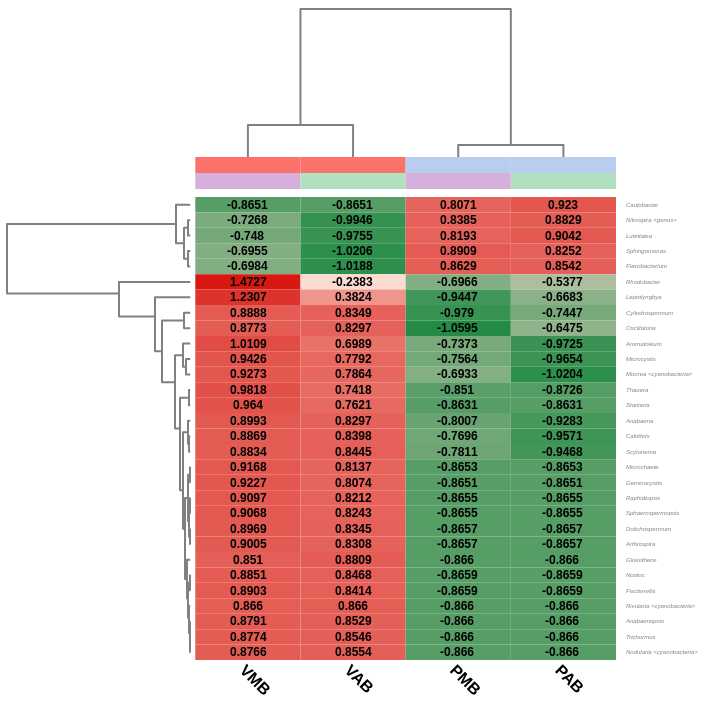 Shows a two-dimensional heatmap in which the abundance values are represented by ranges of colors (figure 14). The dendrograms added to the left and top side are produced by a hierarchical clustering method that takes as input the Euclidean distance computed between OTUs (left) and samples (top).