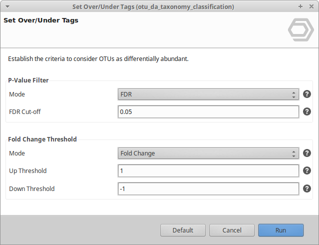 - FC (Fold Change). The ratio between the mean abundance value of a specific OTU in the contrast condition and this value in the reference condition, if the mean abundance value in the contrast group is bigger than in the reference group. If this value is bigger in the reference group, then the FC is calculated as the ratio between the mean abundance value in the reference condition and the value in the contrast condition with a negative sign. By default, an OTU is defined as overrepresented if FC > 2, and it is underrepresented if FC < -2.