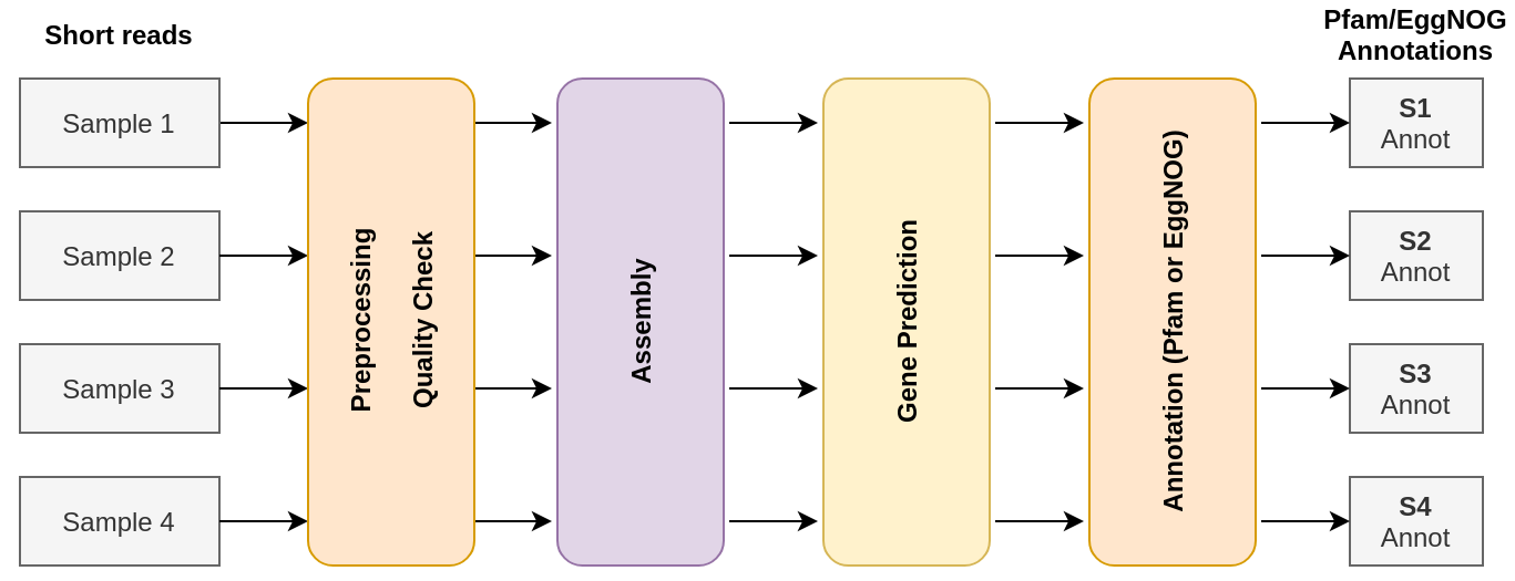 The analysis needs one metagenomic annotation, Pfam or EggNOG, per sample and the condition to which each sample belongs as inputs. To generate the annotations, some previous steps have to be performed in OmicsBox. In starting from having raw reads for each sample, there is the need to perform a Quality Control, a metagenomic assembly, a gene-finding step, and finally the annotation. All these steps need to be running for each sample to finally have one annotation file per sample as shown in Figure 15. The annotation files will be used as input for the metagenomics functional differential abundance test.