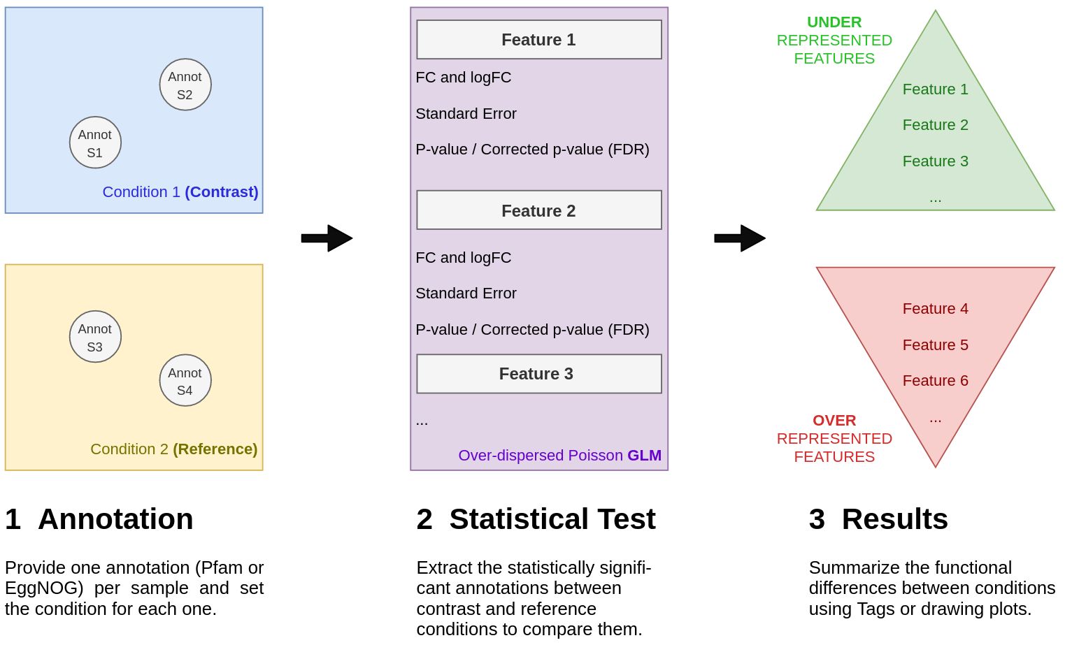 The 2 first tools, sample comparison chart, and graph are visual and allow to compare function abundances between samples. GO Slim generalizes GO annotations to make them comparable.