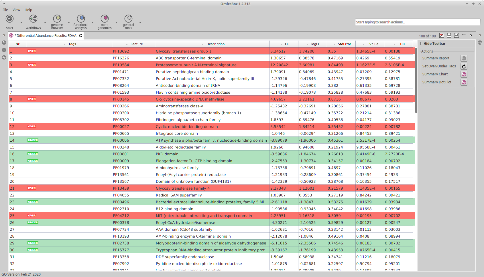 The Metagenomics Functional Differential Abundance Analysis tool is designed to detect which functional annotations are enriched between two different environmental conditions. The statistical test of this tool is based on an over-dispersed Poisson generalized linear model, specifically designed to detect the differentially abundant annotations between metagenomes.