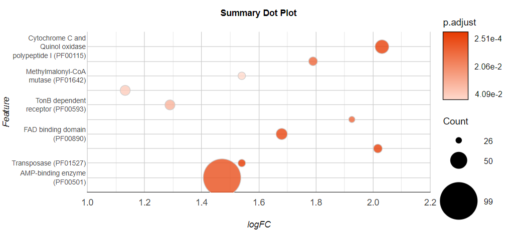 Once displayed, each row of the graph contains an enriched feature. The X-axis represents the effect size (logFC), the dot color represents the significance (FDR), and the dot size represents the number of genes in the global dataset annotated with this feature.