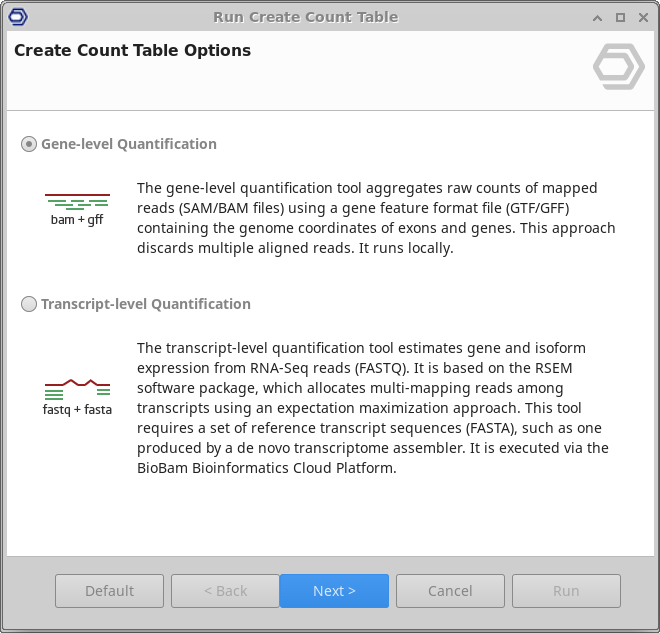 - Gene-level Quantification: The gene-level quantification tool aggregates raw counts of mapped reads (SAM/BAM files) using a gene feature format file (GTF/GFF) containing the genome coordinates of exons and genes. This approach discards multiple aligned reads. It runs locally.