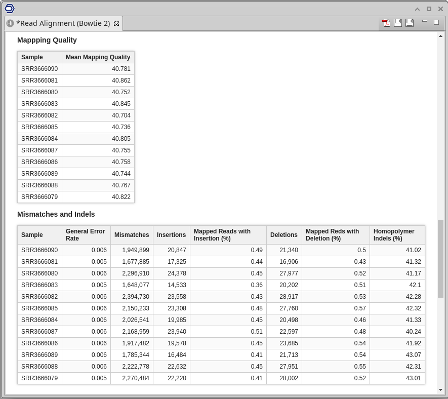 In addition, a report and two charts are generated with complementary information. The report (Figure 6) shows a summary of the DNA-Seq Alignment results. This page contains information about the reference genome sequences, the input FASTQ files, and a results overview. The last section is divided into several subsections: globals, paired information, ACTG content, coverage, mapping quality, insert size, mismatches, and indels.