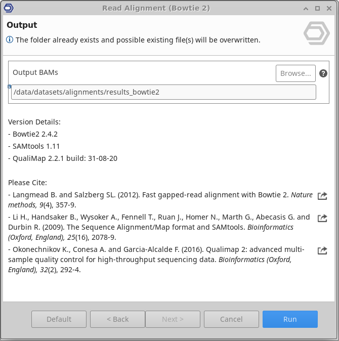 This functionality can be found under Genome Analysis → DNA-Seq Alignment → Bowtie 2. The wizard allows to select input files and adjust analysis parameters (Figure 1, Figure 2, Figure 3, Figure 4, and Figure 5).