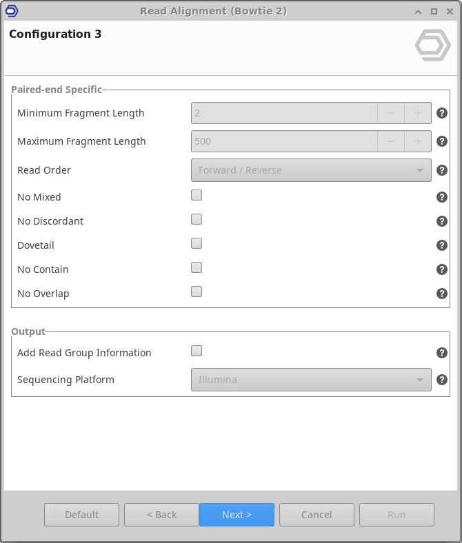 - Do not Align Forward: If specified, Bowtie 2 will not attempt to align reads to the forward (Watson) reference strand.