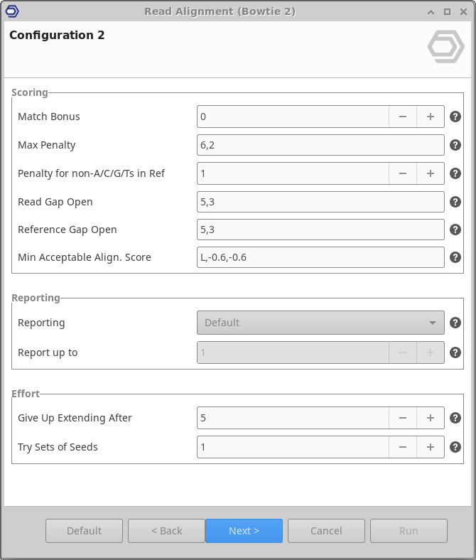 - Give Up Extending After: Set a value up to which consecutive seed extension attempts can 'fail' before Bowtie 2 moves on, using the alignments found so far. A seed extension 'fails' if it does not yield a new best or a new second-best alignment.