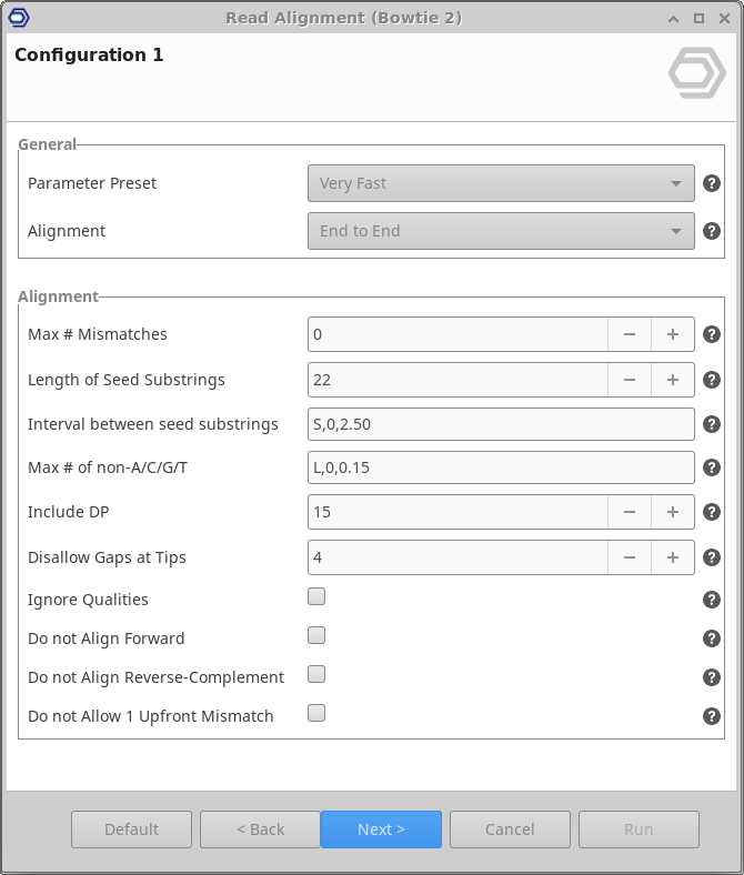 - Do not Allow 1 Upfront Mismatch: By default, Bowtie 2 will attempt to find either an exact or a 1-mismatch end-to-end alignment for the read before trying the multiseed heuristic. This option prevents Bowtie 2 from searching for 1-mismatch end-to-end alignments before using the multiseed heuristic.