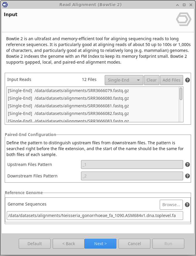 Paired-end Configuration: If paired-end reads are provided, a pattern to distinguish upstream files from downstream files is required. The provided patterns are searched in the filenames right before the extension. The beginning of the filenames should be the same for both files of each sample.