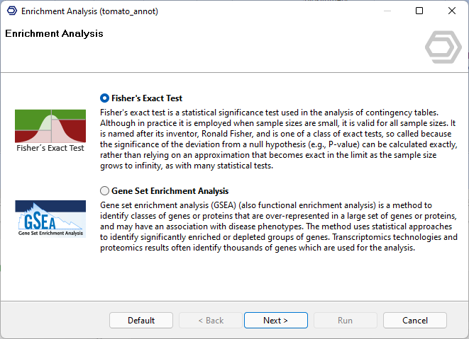 The Functional Analysis module in OmicsBox allows performing both types of tests. The input for each type of enrichment analysis is different. The Fisher's Exact Test requieres a list of IDs for the test-set sequences. On the other hand, the GSEA requires a ranked list of gene IDs where the first column is the sequence identifier and the second column (tab-separated) is the metric with biological meaning e.g the logFC.