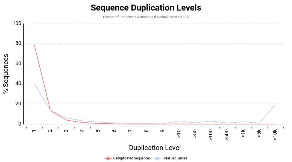- The red line displays the proportions of the sequences that are deduplicated which come from different duplication levels in the original data.