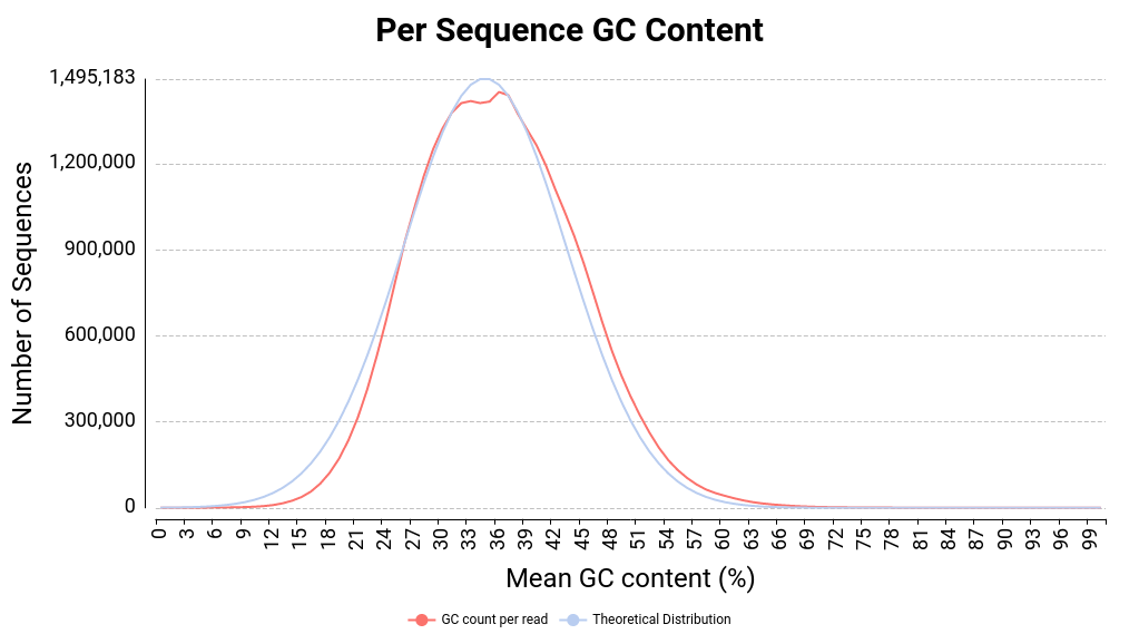 This module measures the GC content across the whole length of each sequence read in a file and compares it to a modeled normal distribution of GC content (Figure 10). Since the GC content of the genome is not known, the modal GC content is calculated from the observed data and used to build a reference distribution.