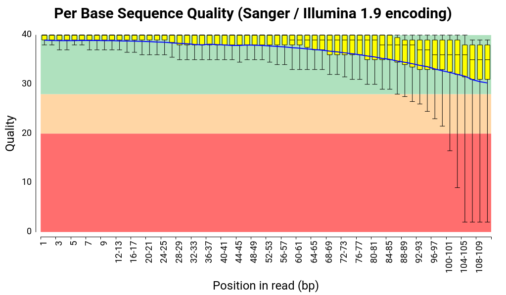 This chart shows an overview of the range of quality values across all bases at each position in the FASTQ file (Figure 7).