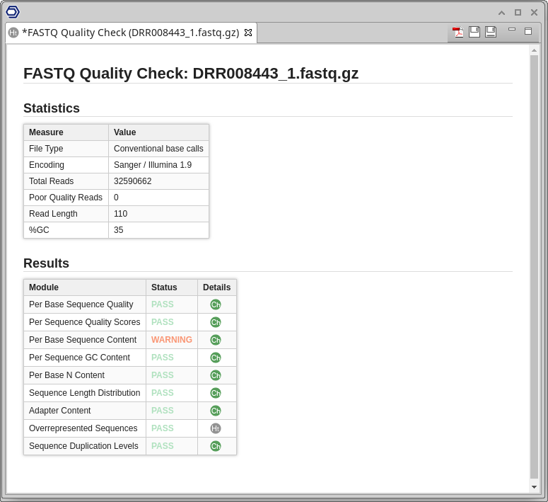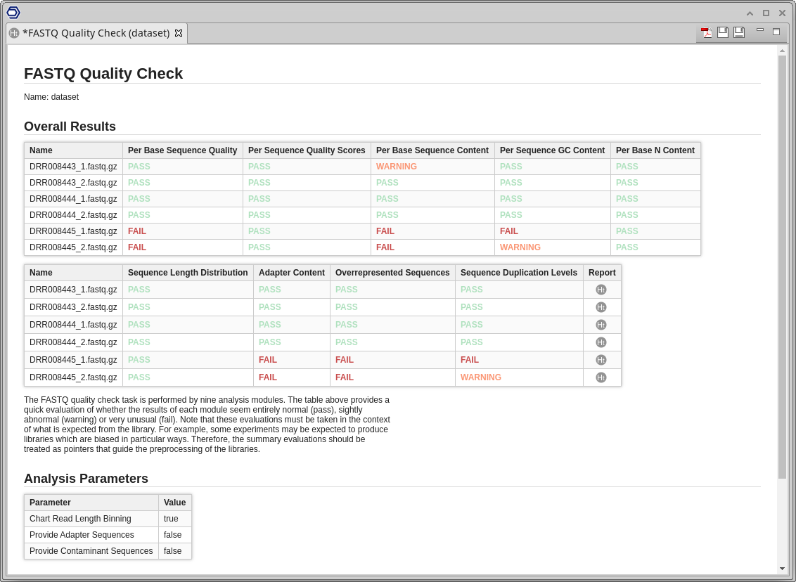 Furthermore, a result page will show a summary of the "FASTQ Quality Check" results (Figure 5). This page provides a quick evaluation of whether the results of each module seem entirely normal (pass), slightly abnormal (warning), or very unusual (fail).