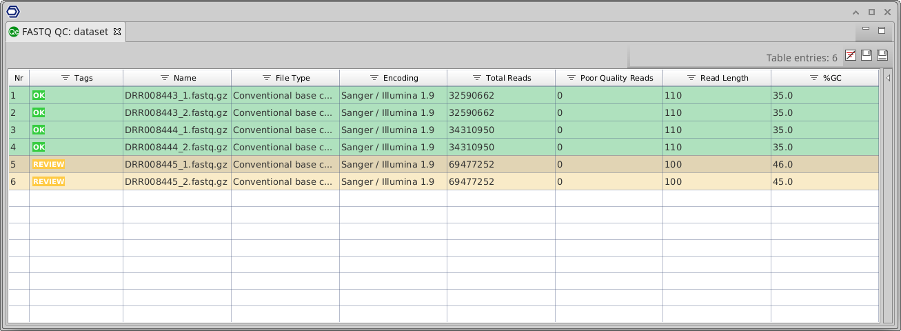 Once finished, a new tab is opened containing simple composition statistics of each analyzed file (Figure 4). Each row corresponds to an input file, and columns show the following information: