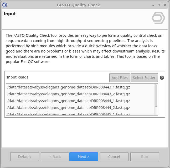 This functionality can be found under General Tools → FASTQ Tools → FASTQ Quality Check. The wizard allows to select input files and adjust analysis parameters (Figure 2 and Figure 3).