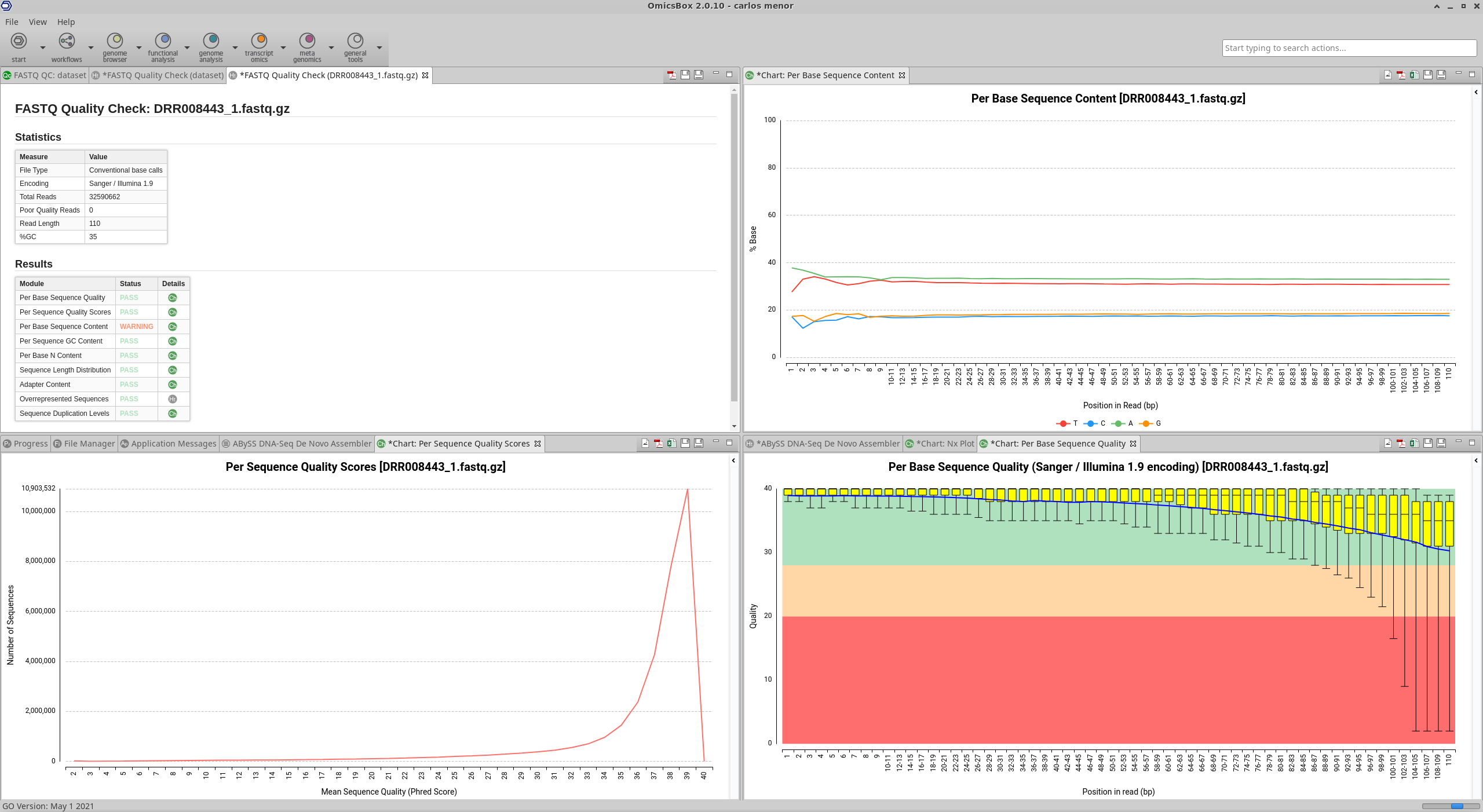 This tool provides an easy way to perform a quality control check on sequence data coming from high throughput sequencing pipelines. The analysis is performed by nine modules which provide a quick overview of whether the data looks good and there are no problems or biases which may affect downstream analysis. Results and evaluations are returned in the form of charts and tables.