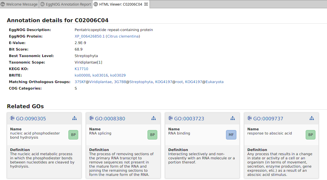 The annotation details (right-click on an annotated sequence → Show Annotation Details) provide link outs where possible and give detailed information about annotated GOs (figure 3).